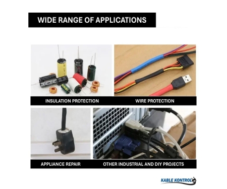Typical applications include: Insulation, Wire Identification, Wire Bundling, Mechanical Protection, Color Coding, Lightweight Harnessing, Physical/Electrical Protection of Components, Strain Relief, and Solder Insulation
