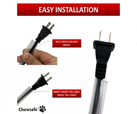 | Safety First. Always unplug the cord before installation. | Read the packaging and be mindful of any safety precautions listed. | Apply to desired cord by simply spreading the Chewsafe cord open and inserting the cord along the pre-slit opening. | Trim to final length using household scissors. Apply final length of Chewsafe to the cord and plug in. |