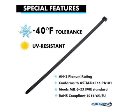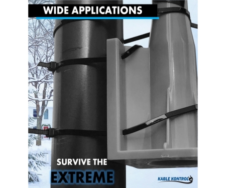 These new cold-weather zip ties are ideal for severe cold temperature applications and have been tested for performance at -40°C (-40°F) per ISO180. These cold-weather cable ties have a tensile strength of 50 lbs & 120 lbs. The inter diameter for these ties is 1.875 to 4.00 inches. These cold-weather cable ties are available in black and can be ordered in packages of 100.