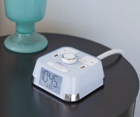 Rethink the Hotel Guest Room Alarm Clock! Desktop Charging Alarm Clock combines a simple alarm clock with the convenience of charging at the nightstand. Desktop Charging Alarm Clock is perfect for a hotel guestroom with its minimal footprint, easy to set alarm, display dimmer, and guest facing power and USB outlets. USB C available for fast charging. Desktop Charging Alarm Clock also features a pass-through plug, surge protection, single-day alarm, auto-update for daylight saving time, security c-clamp and meets strict UL standards including a UL spill test. Now Available in Black or White.