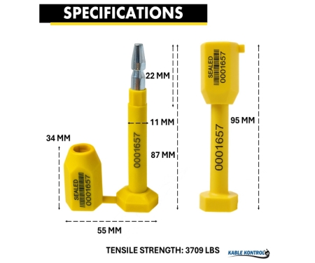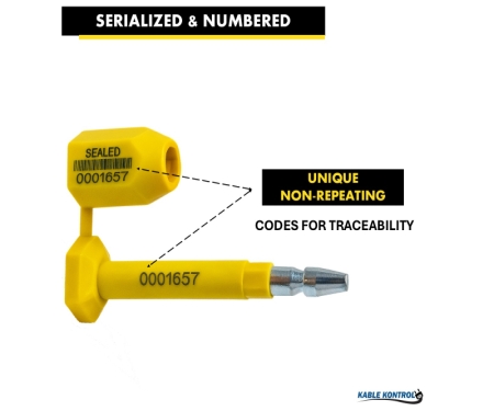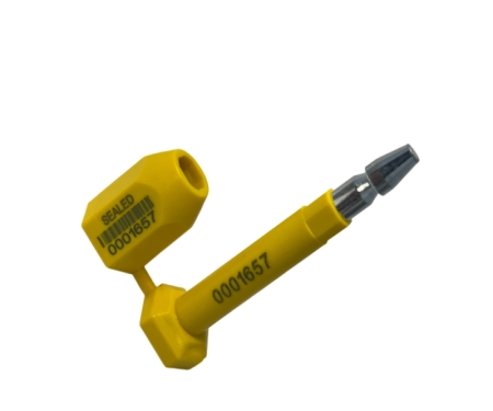 The High Security Bolt Seal is a robust, plastic-coated steel locking device designed to safeguard cargo during transport. Classified as a high-security container seal and compliant with ISO 17712:2013(E) standards, it provides maximum protection and tamper-evidence for global shipping. This single-use, keyless seal features a self-locking mechanism that requires no tools for application, while removal requires bolt or cable cutters. Each seal is uniquely serialized and numbered, ensuring non-repeating traceability and preventing duplication. Built for durability and reliability, it is an essential choice for securing freight containers, truck trailers, and international shipments.