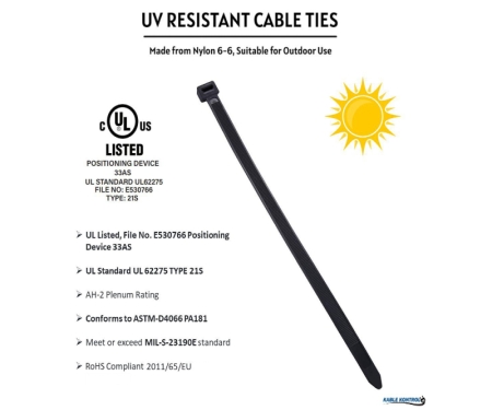 HVAC Duct Cable Ties are crafted with precision for dependable fastening solutions in HVAC duct applications. With a UL Standard of UL 62275 TYPE 21S and UL File No. E530766, these ties meet rigorous industry safety standards. Spanning lengths from 24 to 60 inches, they offer versatility for various HVAC duct bundling needs. The UV-stabilized black option enhances resistance to outdoor elements, making them a perfect fit for outdoor HVAC installations. Exhibiting good resistance to various chemicals and featuring a self-locking design for secure installations, these cable ties are also RoHS compliant, aligning with environmental standards. The clear/natural option, while lacking UV protection, excels in indoor HVAC duct applications, meeting low smoke production standards. With custom marking compatibility, these cable ties offer flexibility for specific HVAC duct identification needs. These ties provide a comprehensive solution for professionals seeking compliant, durable, and customizable cable management in HVAC systems, both indoors and outdoors.