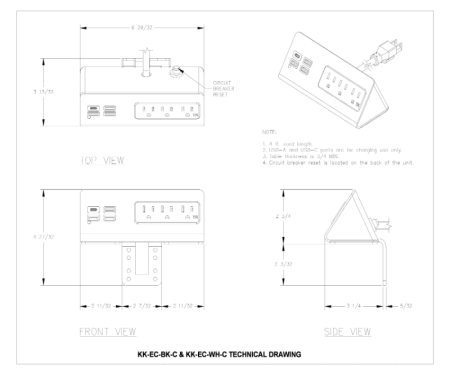 The KK-EC-BK-C provides the power solution with Power and USB charging ports. It is no longer just a power strip, it is a power center for your necessary charging partner. 3 US power outlets with 3 USB ports and 1 USB-C to solving your most charging requirements. The 3 USB-A ports allow you to connect multiple USB-A devices such as mobiles, cameras, or any other gadget. The newly added USB-C port brings easy and fast charging to all of your devices which needs USB-C plug-in. Easy installation especially for hotels, offices, edge mount and secure on the desk with screws, clean and safe.