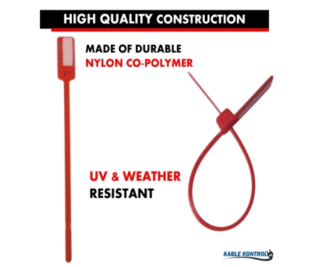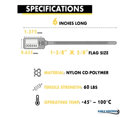 Keeping cables secure and properly identified can be a challenge, especially when accuracy and traceability are critical. Serialized Flag Identification Numbered Cable Ties solve this problem by combining strong bundling, tamper-resistant design, and unique serial numbers for complete peace of mind. Each tie features a durable nylon co-polymer construction with a built-in flag, hot-stamped with a six-digit non-repeating serial number that ensures every tie is uniquely identifiable. Unlike standard cable ties, these provide both physical security and reliable traceability, making them ideal for industries where accountability matters. With a 60 lb tensile strength, these ties securely bundle cables, wires, and equipment while resisting tampering thanks to their one-piece design. UV-stabilized and built for extreme temperatures from -45°C to 100°C (-50°F to 212°F), these ties perform in harsh outdoor or industrial environments without fading or breaking down. With a simple one-piece design, installation is quick and secure, no special tools required.