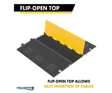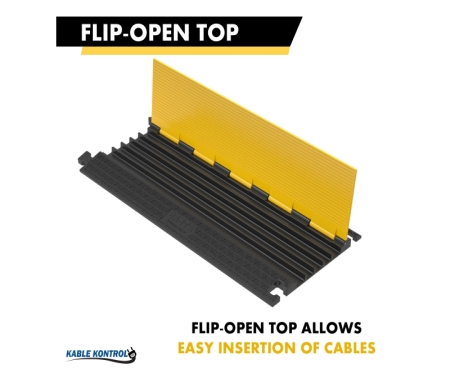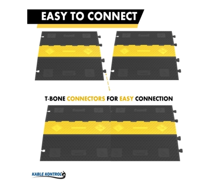 These Atlas heavy duty rubber cable protectors made by Kable Kontrol®, are constructed from industrial grade rubber and designed for the protection of multiple valuable cables or hoses. These durable cable protector ramps will ensure that your wires and hoses do not become potential tripping hazards for any pedestrians that will be walking over them. The hinged lid allows for the easy top loading of cables. Furthermore, due to their rigid manufacturing process, these Atlas heavy duty cable protectors are commonly used both outdoors and indoors as well as in any in weather condition. The black base contrasted against the bright safety yellow lid makes these cable ramps highly visible to any nearby pedestrians, further lowering the possibility of pedestrian injury. With an impressive 33,040 lbs per axle weight rating, this cable protector easily withstands vehicular and pedestrian traffic. The non-skid traction surface provides enhanced stability, reducing the risk of slips or trips in busy environments. The innovative “T” type connector allows for secure interlocking between multiple units, ensuring a seamless and adaptable setup for varying lengths. The recommended operating temperature range is -40º to +130℉. Atlas Heavy Duty Rubber cable covers are designed and manufactured according to the guidelines provided by MUTCD, OSHA, RoHS, REACH. For maximum functionality, the rubber cable protectors have been treated for temperature resistivity and UV-stabilization.