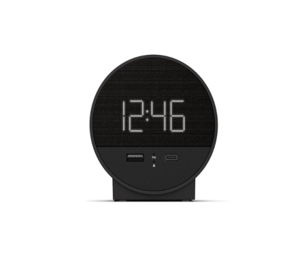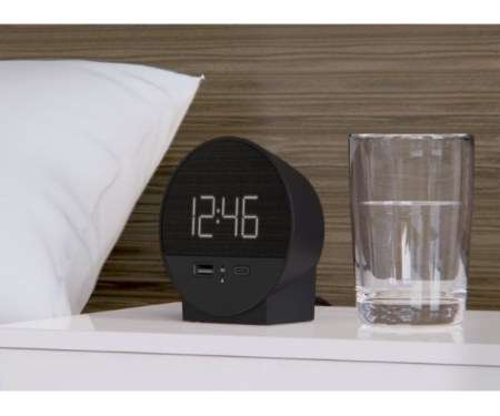 Compact alarm clock in a timeless design with 2 fast charge USB ports.