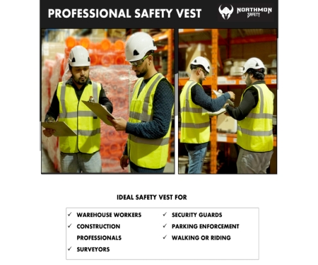 The NORTHMON SAFETY Reflective Safety Vest is specifically designed to meet your safety needs on the job. This adjustable vest ensures that you remain visible and protected even in low-light conditions, making it the perfect choice for construction workers, road workers, surveyors, and anyone else who requires high visibility while working.