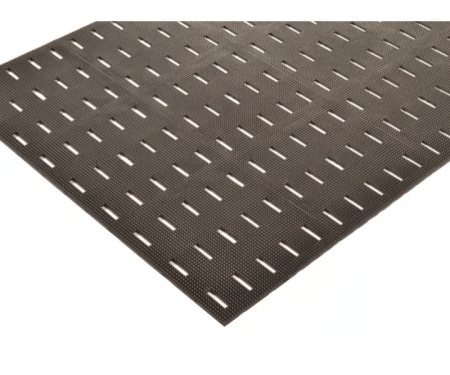 Notrax Cushion-Dek™ is made from a tough PVC compound molded with a raised pyramid design to enhance traction. Slotted perforations allow for moisture to drain from the worker platform in wet environments. A studded bottom surface raises the mat and allows for channeling of moisture.