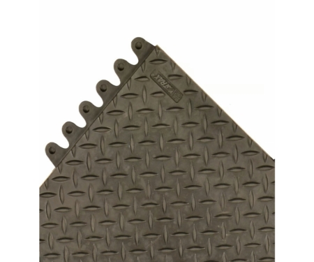 Notrax De-Flex® Niru® is extremely comfortable heavy duty anti-fatigue matting system with popular diamond plate traction surface that can be easily assembled for coverage of large areas or individual workstation mats. Made of 100% nitrile rubber compound that provides the highest resistance to chemicals, cutting fluids, animal fats, oils and greases. The modular rubber tiles are designed with a universal double-locking system on all sides to ensure an extra strong yet seamless connection for fast installation. The platform insulates the worker from the hard ground while the bulleted domes underneath allow the mat to bend and flex with every movement. Unique extended ramp prevents tripping and allows cart access with smart beveling solutions for inside and outside corners.