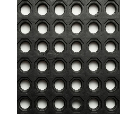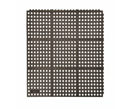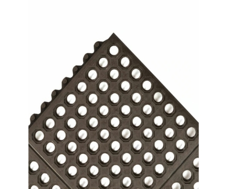 Notrax Niru® Cushion-Ease® FR is a high performance interlocking anti-fatigue fire resistant mat system made with a resilient rubber compound with a drainage top anti-slip surface texture and a multi-nib backing for comfort and ergonomic support of the mat. Made of 100% nitrile rubber compound that provides the highest resistance to chemicals, cutting fluids, animal fats, oils and greases. Fire Retardant rubber is chemically treated to be slow burning or self-extinguishing when exposed to an open flame. Niru® Cushion-Ease® FR mold has been engineered to produce a mat that is functional, comfortable and durable. Large holes provide excellent drainage and aeration leaving a dry, clean work area. All Cushion-Ease® series mats have a male/female interlocking system for individual workstations, long runs, unique configurations and wall-to-wall floors. Also compatible with NoTrax® M.D. Ramp System® for easy on-site custom configurations and trip-resistant platforms.