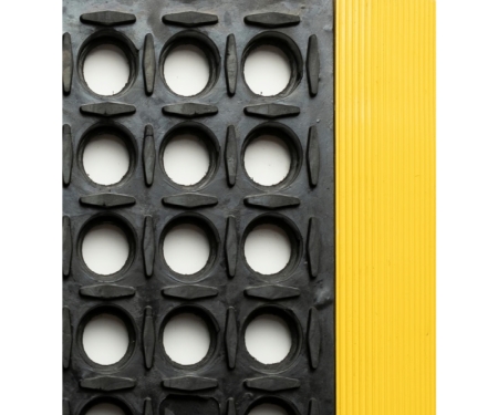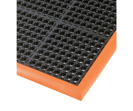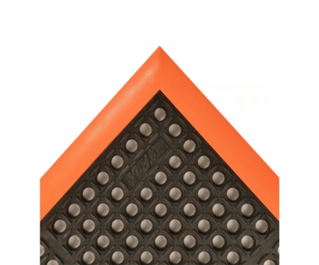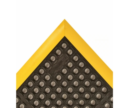 Notrax Safety Stance® is made from a grease resistant rubber compound to withstand many of the more commonly found industrial cutting oils and chemicals. Particularly well suited for wet or dry work areas, Safety Stance® features a large hole drainage system with a mini-diamond studded top surface to minimize slippage. Permanently affixed beveled edges are made from a 100% Nitrile rubber compound offering the same resistance to oils/chemicals as the mat.