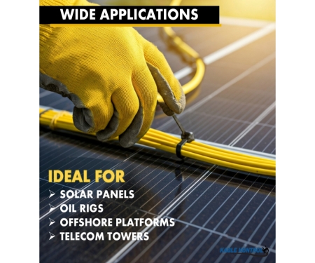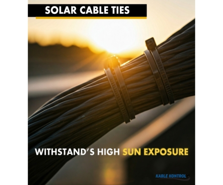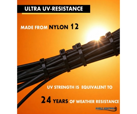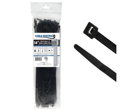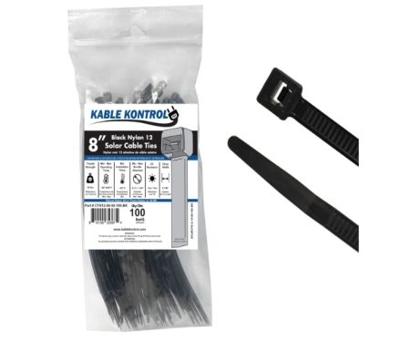 Kable Kontrol Nylon 12 Solar Cable Ties are designed with premium Polyamide 12 (Nylon 12). Solar Zip Ties are specifically engineered for superior durability and long-lasting performance in outdoor and solar applications. With built-in UV inhibitors and carbon black, our solar panel zip ties offer up to years of UV resistance, ensuring they withstand harsh sun exposure without degradation. Highly resistant to salt damage, chemicals, and impact, these ties are perfect for demanding environments such as solar panel installations. They feature an operating temperature range from -40°C to +85°C and can handle short-term exposure up to +110°C, maintaining their strength and stability. With low moisture absorption (<1.0%) and resistance to stress cracking, these solar panel ties ensure reliable performance even in fluctuating weather conditions. The smooth edges eliminate abrasion damage, protecting cables and surfaces during installation. Ideal for galvanized steel contact, they provide secure fastening without causing corrosion or harm. The standard PA12 cable ties are over 3600 hours of UV exposure continually in a UV chamber. The UV strength is equivalent to about 24 years of weather resistance. Designed to excel in solar energy systems, these heavy-duty solar ties are chemically resistant and have a low density, offering enhanced stability, flexibility, and a long lifespan for outdoor use in extreme weather conditions.