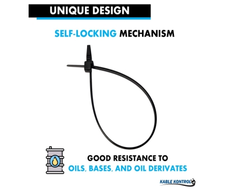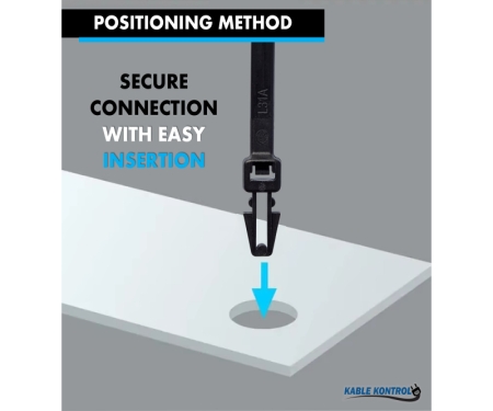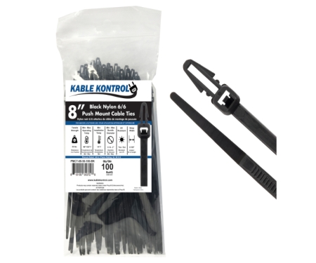 Kable Kontrol Arrow Head Push Mount Cable Ties are made from high quality Nylon ensuring exceptional durability and long-lasting performance. Designed to withstand temperatures ranging from -40°F to +185°F, they can also endure up to +115°C with heat-stabilized material for continuous use and +130°C for short periods. With a 50-lb tensile strength, these cable ties provide a secure and reliable fastening solution for various applications. The UV-resistant arrowhead black push mount cable ties feature carbon black additives, offering superior protection against UV damage, making them ideal for both indoor and outdoor use. The push-mount design allows self-locking and easy installation by snapping into a hole, securely locking the tie into place without the need for wings. Their one-piece construction ensures consistent performance and reliability, while the curved tip allows for fast and easy threading, speeding up the installation process. Our push mount zip ties are RoHS and REACH compliant, meeting environmental and safety standards, making them perfect for use in automotive, industrial, and outdoor cable management tasks.