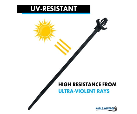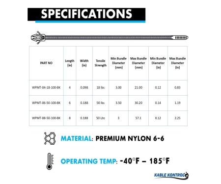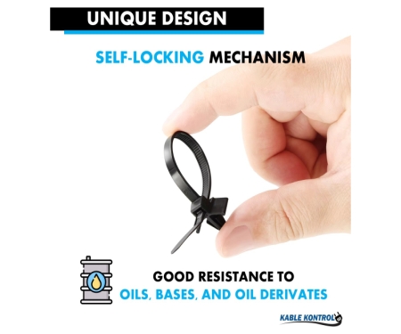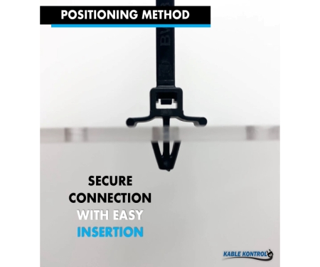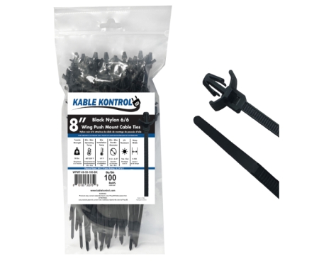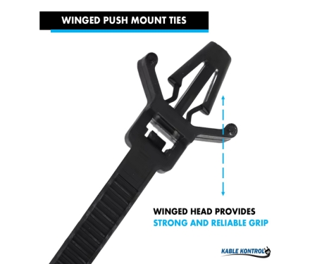 Kable Kontrol Wing Push Mount Cable Ties are made from high quality Nylon ensuring exceptional durability and long-lasting performance. Designed to withstand temperatures ranging from -40°F to +185°F, they can also endure up to +115°C with heat-stabilized material for continuous use and +130°C for short periods. With a strong tensile strength, these cable ties provide a secure and reliable fastening solution for various applications. The UV-resistant black winged push mount cable ties feature carbon black additives, offering superior protection against UV damage, making them ideal for both indoor and outdoor use. Winged Push-mount cable ties create a larger surface area, ensuring that the tie remains firmly anchored to the mounting surface. This helps prevent any movement or slippage of the tie after installation. Their one-piece construction ensures consistent performance and reliability, while the curved tip allows for fast and easy threading, speeding up the installation process. Our wing push mount zip ties are RoHS and REACH compliant, meeting environmental and safety standards, making them perfect for use in automotive, industrial, and outdoor cable management tasks.