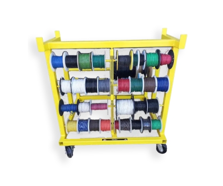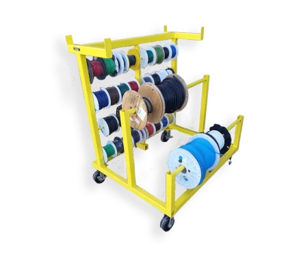 Clyde’s Cart is a large capacity wire dispenser rack on casters. It allows you to store your wire and dispense it when you need. Specifically designed top bracket to accommodate a piece of plywood to convert it into a worktable.