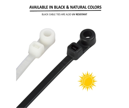 Kable Kontrol’s Screw Mount Cable Ties allow you to attach your secured cable bundle to any surface you desire – communication racks, walls, or ceiling. These zip ties with screw holes allow for quick permanent mounting installation. Only black nylon mount head cable ties are UV resistant. The curved tip makes it easier to do the beginning threading which allows for an easy and quick installation. These zip ties with screw holes are available in either black and natural, with the black being UV resistant.