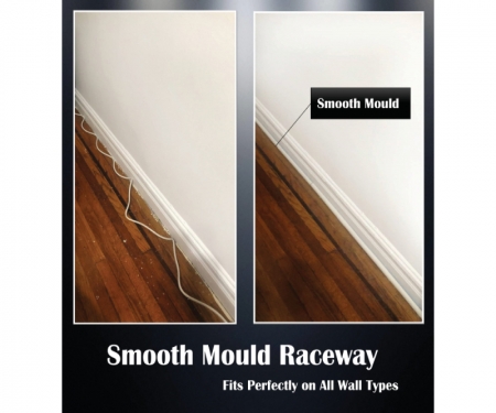Providing electrical insulation and combustion resistance, our Smooth Mould Cable Cover is the safest and most attractive option for routing, concealing and protecting your indoor cable runs and drops. The white body can also be painted, allowing for an exact complement to your room. With entertainment and speaker systems, extension cords, phone or internet lines, our interior spaces at home or in the workplace are forever filling with runs of wires. But the need to route wires through walls or to remove baseboards is gone forever with the slick, seamlessly fitting Smooth Mould Cable Covers, 5’ lengths of attractive base & profile that are long lasting yet will not discolor or crack with time and add aesthetic appeal to any room. With the Smooth Mould® Cable Cover, you will effortlessly route wires and cables from phone or internet lines, sound systems, lighting and much more around corners and down drops, without leaving runs visible. Exposed drops of wire leave a room appearing not only messy, but with an unfinished look. However, not only concealing, the Smooth Mould is unique from other covers as it features connecting accessories which will slide behind the profile rather than snap over-top. Snapping connectors often leave gaps and elevated areas, fracturing attractive appearances of covers. But the Smooth Mould appears seamless, sleekly concealing and protecting the cables within. The 5’ body features a hinged, attractive dome profile, and is excellently impact resistant, so daily wear will not harm it. The hinge allows insertion of wires to be extremely easy, so even if you are installing runs with many cords or that are high up, you do no need to juggle a separate profile. The distinguished white body is inherently UV resistant, boasting color retention and resilience against pinking, so even in rooms with bright sunlit, there is no discoloring over time.