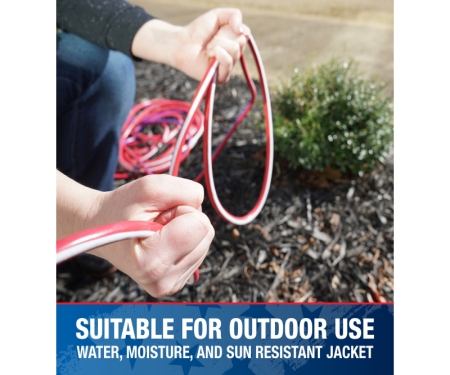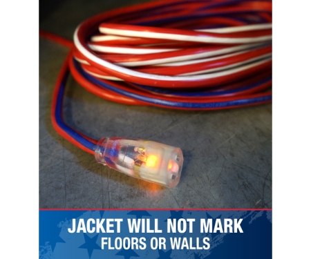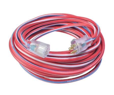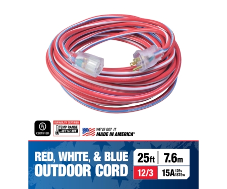 This patriotic extension cords are perfect for displaying America’s colors on the jobsite. It is a heavy duty, all-purpose extension cord rated for -40˚ F to 140˚ F (-40˚ C to 60˚ C). The flexible vinyl jacket provides protection against moisture, abrasion, and sunlight. The extra durable oversized, clear molded plug prevents accidental bending or breaking and is UL listed for your safety. With 15 amps, 125 volts, and 1875 watts, it is suitable for jobsites, workshops, warehouses, and more. It comes in two lengths – 25 feet and 50 feet – and is recommended for use with heavy duty equipment and tools. Show off your patriotism with this patriotic striped contractor grade extension cord.