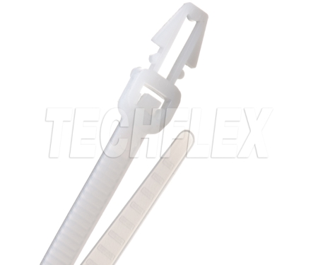 Push Mount Cable Ties securely attach cable bundles to other surfaces, such as the wall, ceiling, or a control panel, through a pre-drilled hole. Featuring a quick-mounting one-piece design for extra stability, reliability, and consistent performance, the head of the push mount cable tie can be easily inserted through the pre-drilled hole, and its tensioning wings will then quickly and easily lock into place. These versatile push mount cable ties can hold up to 50 lb. of tensile strength and mount in a 1/4" hole in any panel up to 1/8" thick. These 7" cable ties come in black & natural color.