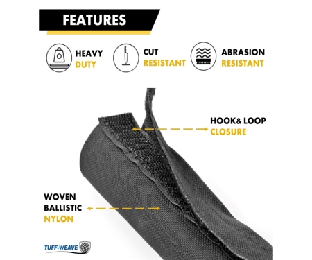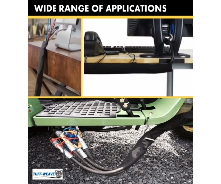 Innovation: Featuring a tightly woven construction and an industrial-strength hook and loop closure, Tuff Weave sets the standard for heavy-duty woven sleeving, providing superior protection and reliability in demanding environments.
