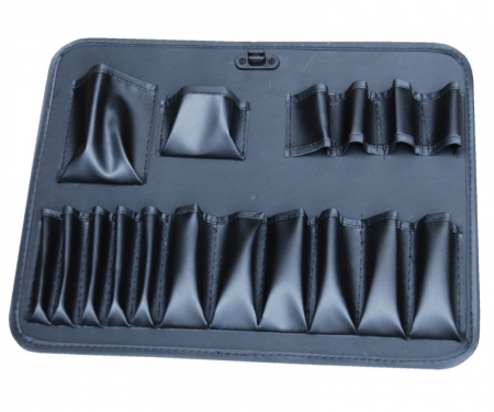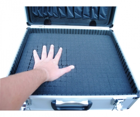 - Storage area includes segmented walls, adjustable panels, or perforated foam insert