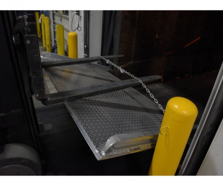 The Aluminum Truck Dock board is engineered and built to maximize safety while handling heavy fork trucks and loads. The beveled edge is designed for smooth entry and exit. Locking legs prevent movement during loading and unloading operations. Locking legs are uneven to allow the dock board to sit canted, while not in use, for easier pickup by fork trucks. Welded aluminum safety curbs prevent accidental runoffs and provide visible driving lane. When using three-wheeled fork trucks order dock board with capacity at least four times the lifting capacity of fork truck. The width of the dock board should be at least 15 (in.) wider than the load or equipment passing between the curbs. Bend is 11 degrees and 9" from the edge and the legs are 12" from the edge. Manufactured in compliance with OSHA.