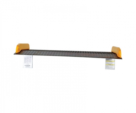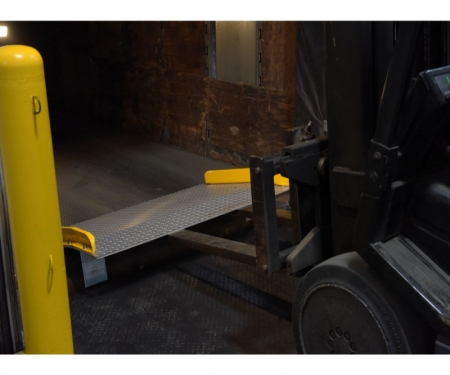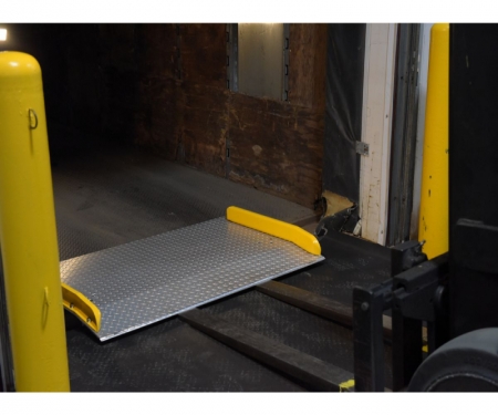 Aluminum Truck Dockboards with Steel Safety Curbs are designed for portability and safety. The deck is made of tough high strength aluminum diamond tread plate. The edges are beveled for smooth entry and exit. Safety curbs are yellow baked-in powder coated for toughness and are constructed of steel with cast tapered ends. Steel legs are bolted on for increased durability. Legs are located 11" from the beveled edge. The legs are canted for easier fork truck portability. The bend is 11 degrees and 9" from the beveled edge. Manufactured in compliance with OSHA. When using three-wheeled fork trucks order dockboard with capacity at least four-times the lifting capacity of fork truck.
