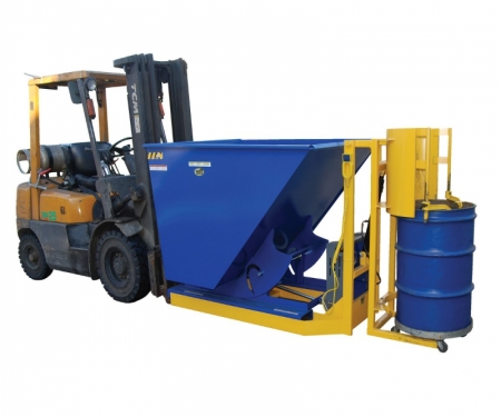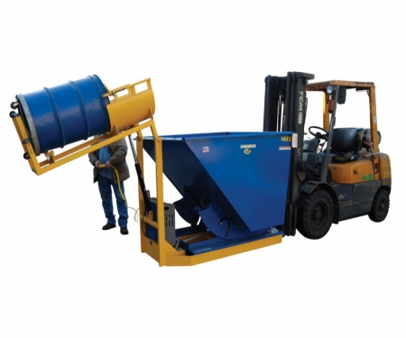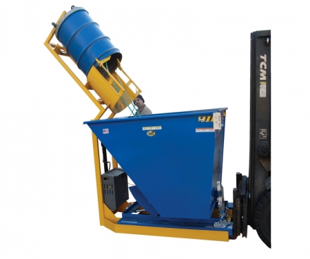 - One person with fork truck can safely and easily dump drums into a hopper