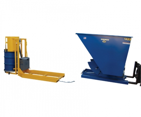 One person with a fork truck can safely and easily dump 55 gallon drums into a hopper. DC powered operation with on-board battery charger. Raise time is 10 seconds and lowered time is 8 seconds. Dump height is 55-3/4". A 2 cubic yard Vestil "D" style hopper is available separately to collect trash. Custom configurations can be made for most trash containers.