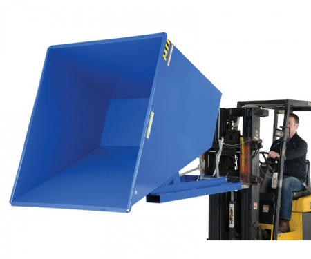 Hopper automatically dumps when bumper release contacts the front of the dumpster. Hopper returns to an upright and locked position automatically after it dumps. Also includes a cable that may be operated from the seat of the fork truck to manually dump the hopper. A safety restraint is provided to secure the hopper to the fork truck. Usable fork pockets are 7-1/2"W x 2-1/2"H. Self-dumping hoppers facilitate compliance with OSHA General Industry rule 29 CFR 1910.178(m)(5)(iii) by allowing lift truck operators to remain at the controls of their truck throughout the dumping process. Optional leak proof design sold separately. D-25, D-33, D-50, D-75, and D-100 are stackable if you stack the top hopper turned 90 degrees from the bottom. Blue baked-in powder-coated toughness is standard.
