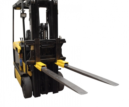 Provide the extra support needed to lift long or large objects with a fork truck using a pair of Fork Extensions. Welded steel construction with cast steel tips. Steel rear spacers prevent fork extensions from sliding off forks during use. Powder coat yellow finish. OSHA regulations require that extensions are no more than one-hundred and fifty (150) percent of the existing fork length. Insert loop at the tip of the fork and slide it up at a forty-five (45) degree angle. Then, lay it down over the existing fork. The rear spacer makes loading pallets into rear of trailer conveniently and easily. Practical for pushing pallets two or three deep into a trailer. Provides the needed extra length when standard forks can't reach product All steel construction provides long lasting reliable use Each extension includes warning and operating stickers for worker safety Includes rear spacer for increase loading ability.