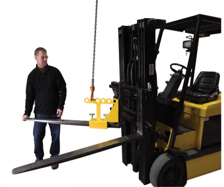 Designed to quickly and easily attach or remove forged steel forks from a carriage. The lifter features six different hook points to balance a variety of fork lengths. Two tightening knobs are included to secure the fork to the lifter when being moved. Steel construction with tough-baked in powder-coated yellow finish.