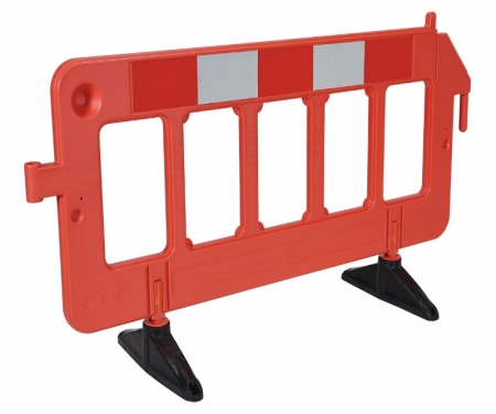 Portable barriers with removable base feet. Manufactured from virgin HDPE material and includes UV stabilizers for longer life. Top section of each barrier side includes reflective tape. Base feet are 23" long each and are manufactured from black recycled rubber.