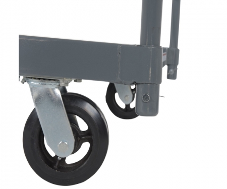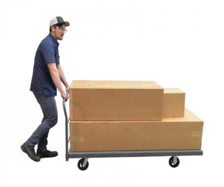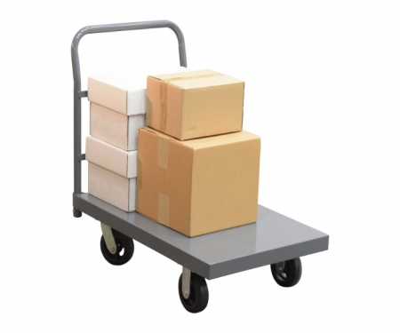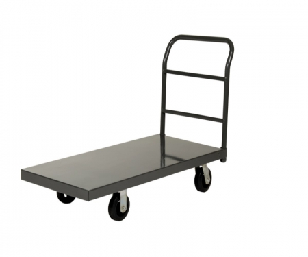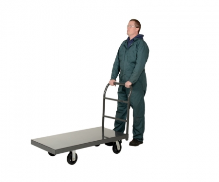 A steel platform truck is a perfect addition to any warehouse or shipping center. The steel platform design enables the user with a better sense of security. With a smooth surface, the amount of abrasion and scuffs during movement is limited. The steel handle allows the user to maintain an ergonomic posture while transferring goods. Mold on rubber casters roll smoothly. Powder coated finish provides added toughness.